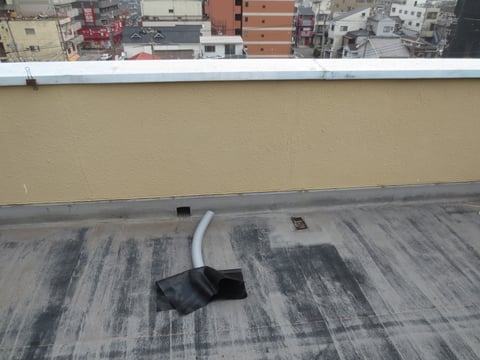 屋上の防水層をやり替えるには多大な費用がかかるため、応急的に排水ドレンの改修を行うことにしました。既存の錆びたドレンの中に新しいドレンを差し込み、塗り継ぐ方法を取りました。